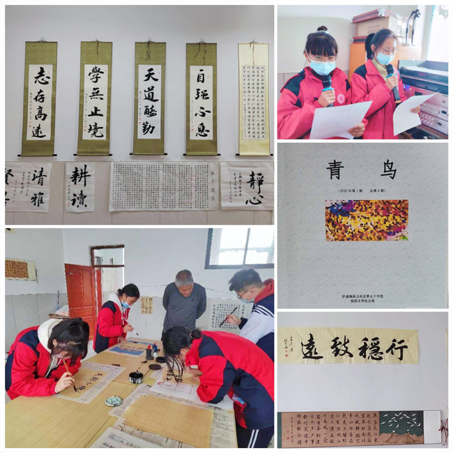 文学社团立足音乐星空、校园快讯、进德修业、文学沙龙、英语乐园五个板块,打造一支了解时事、传播正气、传承经典、讲好五中故事的文化宣传队伍,由两位教师创编的《青鸟》校刊,不仅成为了学生的知音,还跃升为学校的人文徽章。书法社团为学生讲解书法的基本知识,提高学生书写水平,培养学生书法兴趣,感受中华书法之美。